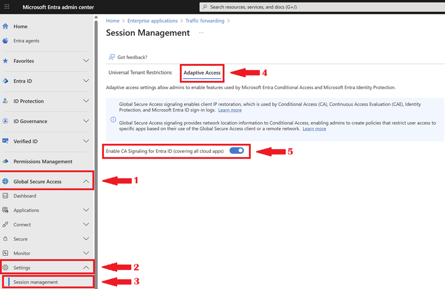 In Entra Admin Center open 1. Global Secure Access, 2. Open Settings, 3. Open Session Management, 4. Open the Adaptive Access tab, 5. Set Enable CA Signaling for Entra ID.