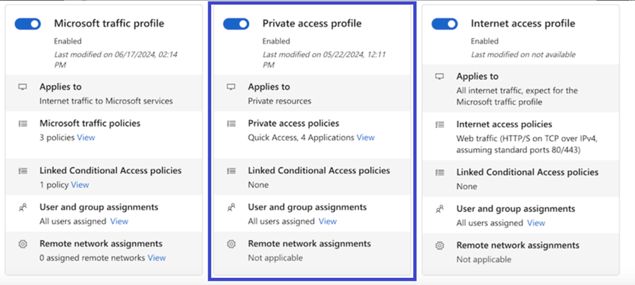 The traffic forwarding profile required for Private Access is the Private Access profile. In this profile, you can assign one or more user groups that will use Private Access and receive the traffic forwarding rules.