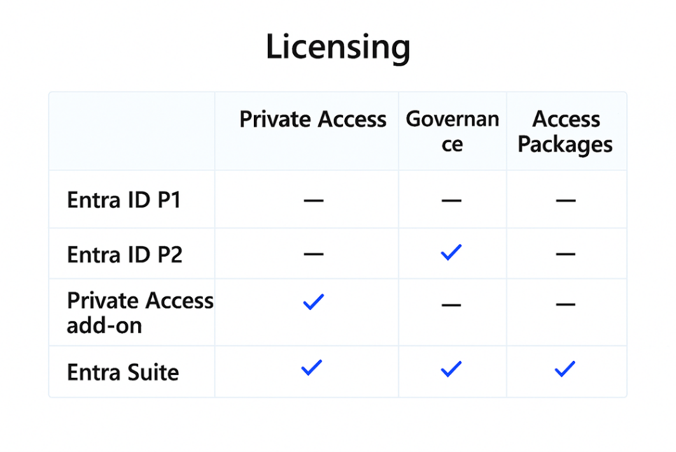 Entra ID P1 and P2 licenses do NOT contain the full feature pack of Private Access or Governance.