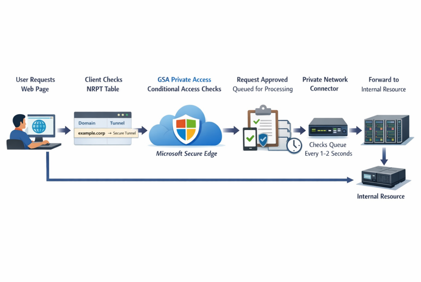 A user requests access to a web page → the client checks its NRPT table → if there is a match, traffic is tunneled to the Microsoft Secure Edge service → the request is evaluated by GSA Private Access, including Conditional Access checks (for example, device compliance) → if approved, GSA queues the request → every 1–2 seconds, the Private Network Connector checks the queue, retrieves the request, and forwards it to the internal resource.