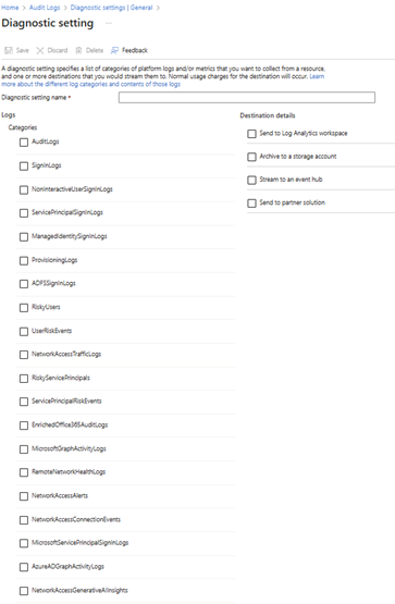 There is also an Audit section where you can configure Export Data settings. These settings allow you to forward logs to destinations such as a Log Analytics workspace, a storage account for archiving, an Event Hub, or a partner solution.