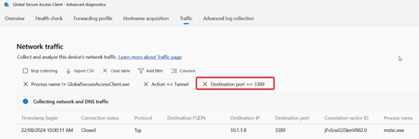 Client logs can be found within the GSA client itself. Here you can find the ‘Health Check’, the ‘Forwarding Profile’ with network access rules, DNS requests in ‘Hostname acquisition’, current tunneled traffic in ‘Traffic’ and ‘Advanced log collection’.