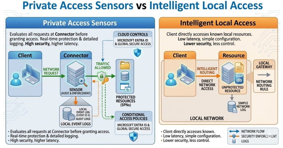 Private Access Sensors enforce Conditional Access by requiring traffic to flow through the connector. Intelligent Local Access improves performance by allowing direct connectivity. Because of these opposing requirements, both features cannot be used simultaneously for the same resource.