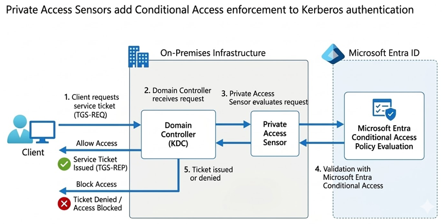 Private Access Sensors provide a powerful way to extend Zero Trust principles to traditional on-premises services. By validating Kerberos service ticket requests against Microsoft Entra Conditional Access policies, organizations can apply modern security controls to protocols that historically relied only on Active Directory authentication.
